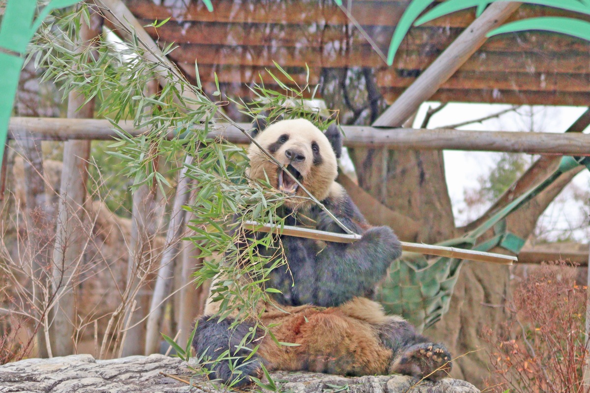 最后,我们前往本次旅程的重点——熊猫森林。 我们看到了可爱、活泼的雌性熊猫“蕾蕾”! 可惜的是, 她的双胞胎哥哥、雄性熊猫“晓晓”,住在另一个室外展区,所以这次我们没能见到他。 在平日, 参观晓晓需要等待20到40分钟,而在周末和节假日则需要等待60到90分钟。()那天,蕾蕾正津津有味地啃着新鲜的竹笋。 每年四五月份,上野动物园都会用从邻近的上野东照宫采摘的竹笋喂养熊猫。 这使得上野公园的动物们也能受益于这片区域的自然美景。(信息截至2025年4月。)